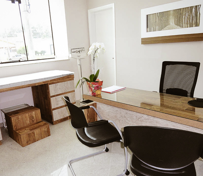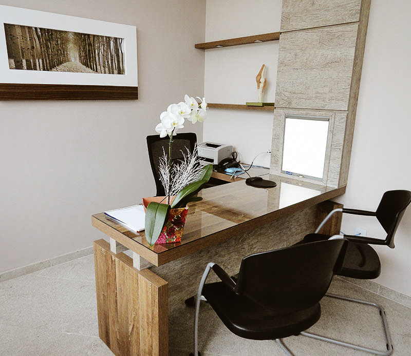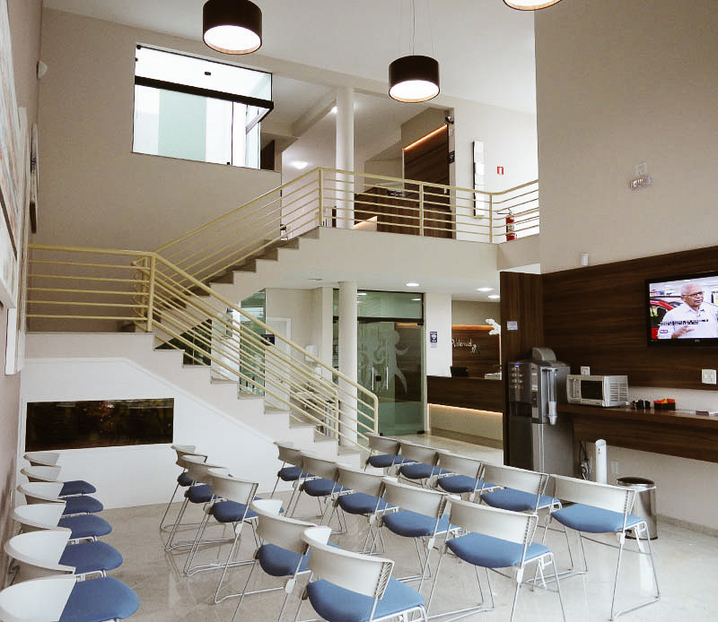 Aguarde seu atendimento com água e cafezinho em um espaço amplo e arejado.